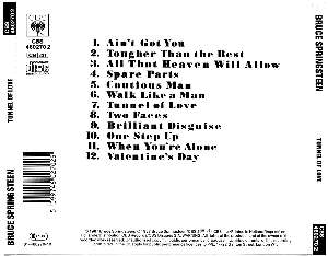 | Recorded In New Jersey ("One Step Up" recorded at A&M Studios, Los Angeles, California)Mixed at A&M Studios, Los Angeles, California; Assistant: Mark McKenna ("Tunnel of Love" mixed at The Hit Factory, New York City; Assistant: Jay Healy)Additional Recording And Assistants:The Hit Factory, New York City - Tim Leitner, Roger TalkovKren Studio, Los Angeles, California - Squeek StoneA&M Studios, Los Angeles, California - Rob JacobsAll recording and mixing on Sony DigitalThe E Street Band Is:Roy Bittan, Clarence Clemons, Danny Federici, Nils Lofgren, Patty Scialfa, Garry Tallent, Max WeinbergArt Direction: Sandra ChoronPhotography: Annie LeibovitzManagement: Jon Landau; Barbara Carr, Associate; Denise Sileci, Office ManagerThanks to Walter Yetnikoff, Al Teller, and everyone at Columbia Records and CBS Records International for their friendship and commitment over the years.Thanks JuliAll words and music by Bruce Springsteen.All songs copyright 1987 Bruce Springsteen (ASCAP).All rights reserved.Used by permission.Manufactured by Columbia Records:CBS Inc.51 W. 52 StreetNew York, NY |